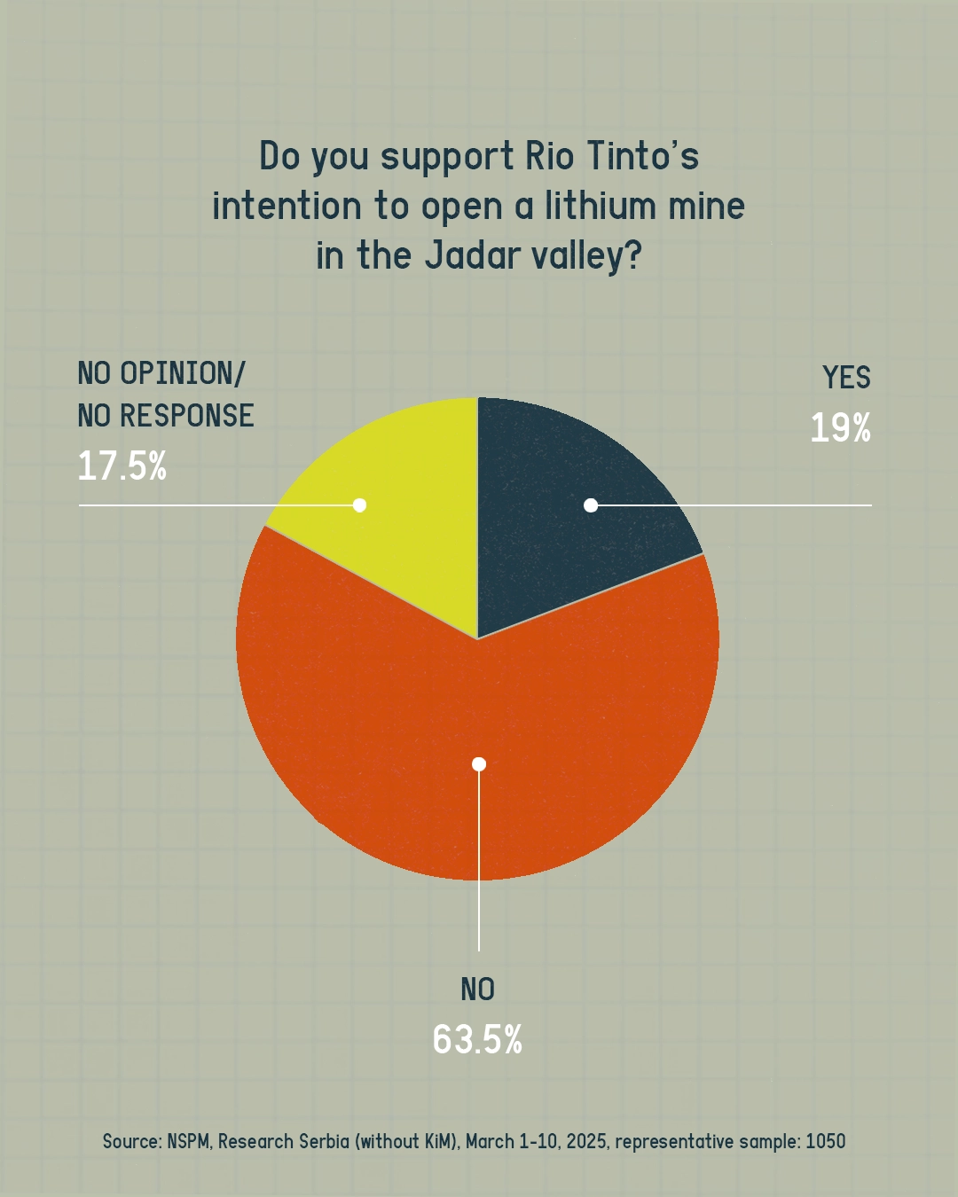 According to the latest survey by the Nova Srpska Politička Misao (NSPM), 63.5% of Serbian citizens oppose the lithium mining project, meaning that opponents outnumber supporters by more than 3 to 1.